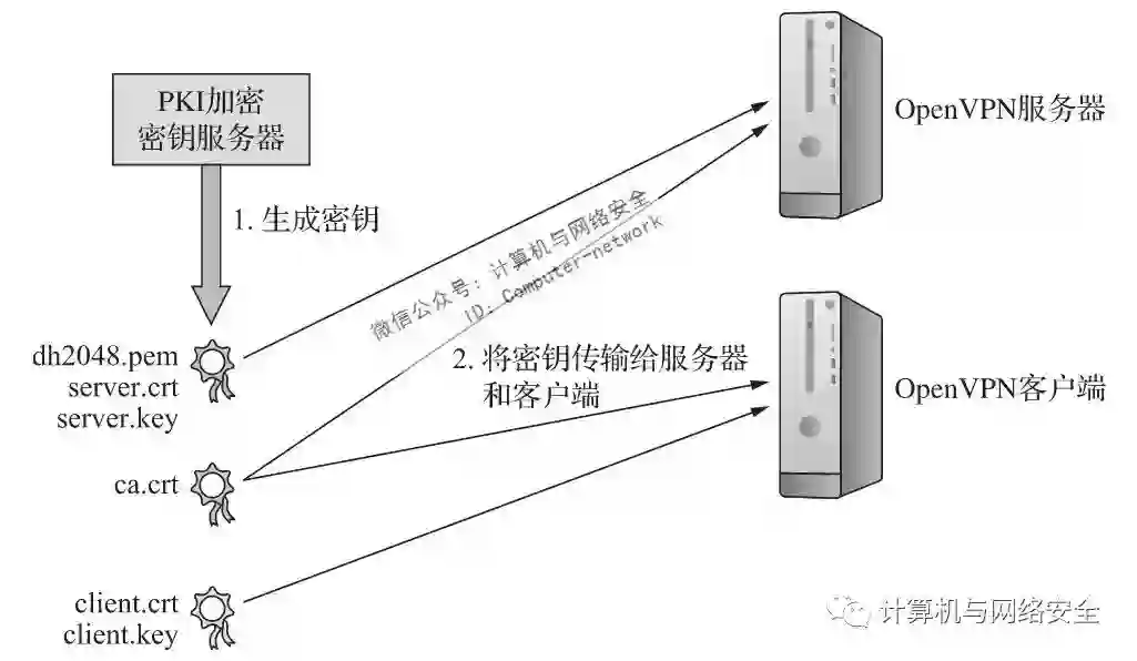 简单起见,将在运行OpenVPN服务器的同一台机器上设置密钥基础设施。然而,安全最佳实践中常常建议在产品级部署中使用一台独立的CA服务器。无论何种情形,图2都可以说明为OpenVPN应用生成和分发加密密钥资源的过程。