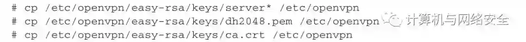 现在,服务器端的密钥将被写入/etc/openvpn/easy-rsa/keys/目录,但是OpenVPN并不知道这些。OpenVPN默认在/etc/openvpn/目录下进行查找,因此,要将它们复制过去,操作如下: