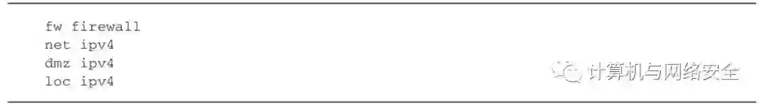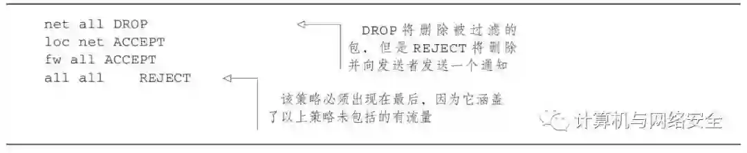policy文件建立默认基准行为。图11中,第一行将默默地删除从互联网(net)到任何目的主机的所有流量。第二行允许从私有区域(loc)传出到互联网的流量,这使得本地计算机可以接收软件更新。第三行表明源自防火墙的流量在任何地方都应被接收。最后一行拒绝任何不包含在其他规则中的包。