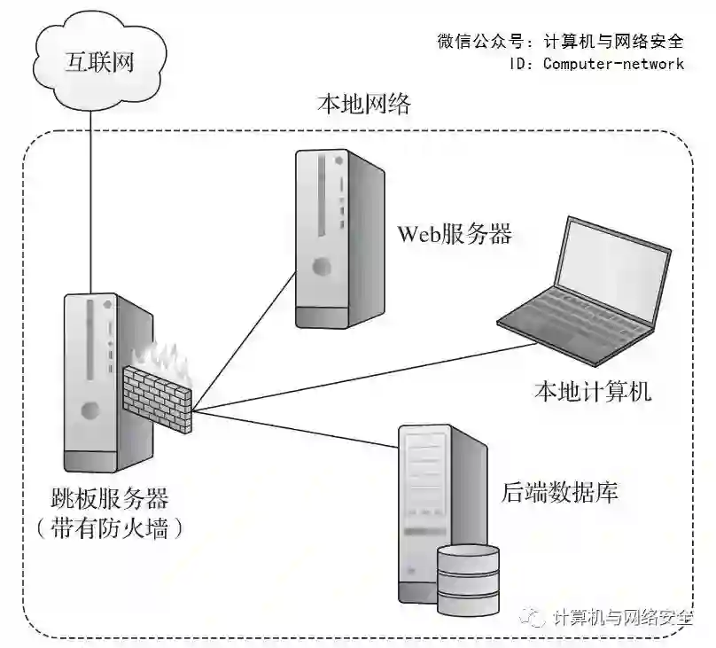 跳板服务器(jump server,有时也称为跳板机(jumpbox),或者,也可能称为堡垒主机(bastion host))是一个对互联网开放的轻量级服务器,它只有一个功能:允许远程的SSH客户端登录,之后“跳转到”跳板服务器所在私有网络中的其他服务器。如图8所示,网络中的私有服务器将具有某类访问控制,只允许来自跳板服务器的远程登录。