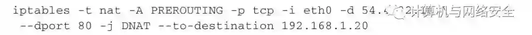 下一条规则将被添加到NAT表(-t nat)中。它使用TCP协议来处理所有通过eth0接口的流量,该接口针对应用程序的(虚拟)公共IP地址(54.4.32.10),并指定要使用HTTP 80端口。满足这些条件的任何流量都将被重新路由到DMZ(192.168.1.20)中Web服务器的互联网地址: