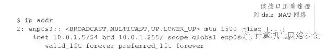 完成上述操作后,可以启动三个虚拟机并登录。在每个虚拟机上运行ip addr命令,以确认这些接口已经被识别且连接到了它们的网络。如果在inet行看到了正确类型的IP地址(如10.0.1.5/24),那么这些就都已经在运行: