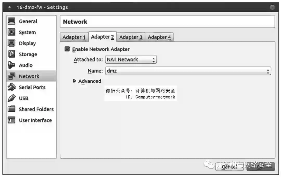 现在,点击Adapter 2选项卡,之后点击Attached To下拉菜单,并选择NAT Network选项。因为之前已经创建了两个NAT网络,这两个网络都会在选项中出现(图13)。为Adapter 2选择其中的一个选项,为Adapter 3选择另一个。