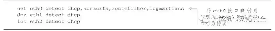 现在,需要创建一个名为interfaces的文件,在该文件中将每个新的区域与连接到shorewall服务器的三个网络接口中的某一个进行关联,如图10所示。detect命令让shorewall明白,想自动检测网络配置;dhcp意味着通过DHCP服务器为网络接口自动分配IP地址。在接入互联网的接口上,nosmurfs、routefilter以及logmartians将过滤可疑的包、源端域以及与日志相关的事件。