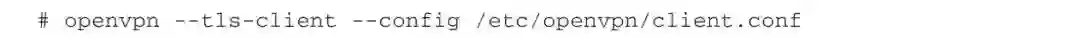 在客户端启动OpenVPN之前,并不会发生什么令人兴奋的事情。因为需要传递几个参数,所以,要从命令行开始操作。--tls-client参数告诉OpenVPN将作为一个客户端并通过TLS加密进行连接,同时,--config参数指向配置文件: