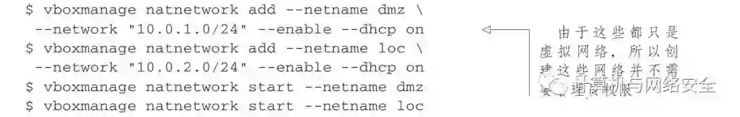 第一步,将使用vboxmanage命令行工具(为DMZ配置创建网络)。natnetwork add命令通知VirtualBox想添加一个新的NAT网络。在第一个示例中,netname是一个dmz区,子网是10.0.1.0/24。第二个网络被命名为loc(本地),其子网为10.0.2.0/24。创建了这些网络后,就可以用natnetwork start命令启动它们了: