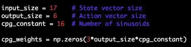 花一分钟来消化代码。本质上,这里所发生的是,对于output_size向量中的每个动作值,我们通过提取输入到正弦波中的振幅、频率和相位来产生正弦输出。我们对操作向量中的所有output_size项执行此操作,对于每个迭代,将所有cpg_constant迭代组合在一起(因此在我们的示例中,对每个操作项值将16个正弦输出相加)。最后,我们将输出向量与线性控制项相同地裁剪,然后根据SCN将这两项相加。