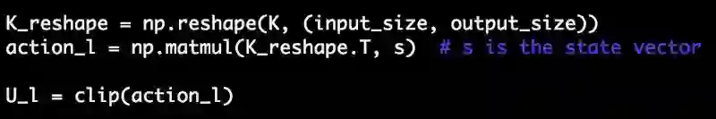 我将K增益矩阵向量调整为(input_size x output_size)大小的矩阵。 转置这个结果矩阵产生动作矩阵,大小为(output_size x input_size。)。这个动作矩阵乘以(input_size x 1)大小的状态向量后,可以得到一个(output_size x 1).大小的动作输出向量。