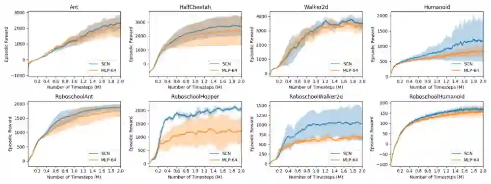 使用PPO作为训练算法,训练结构化控制网络(蓝色)与多层感知器(橙色),在2M时间步长time steps下的训练曲线。与现有的先进技术相比,我们在最终奖励和采样效率方面都显示出了显着的提高。