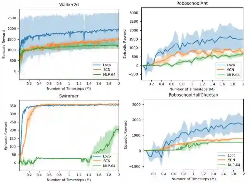 上图是采用ES训练运动神经网络(蓝色为案例研究网络)、结构控制网络(橙色为SCN)、基线多层感知机(绿色为MLP) 在2M时间步长的训练曲线。