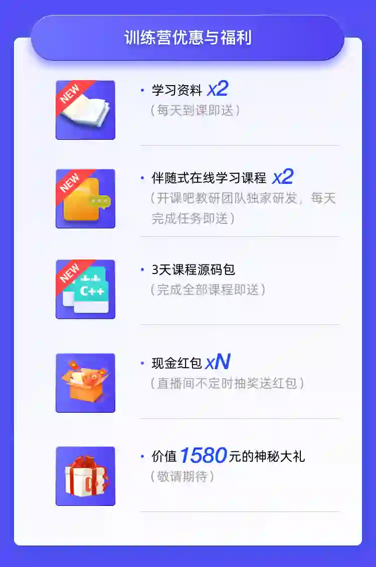 除此之外,还会给大家免费赠送由开课吧自主研发的独家伴随式学习课程,包括