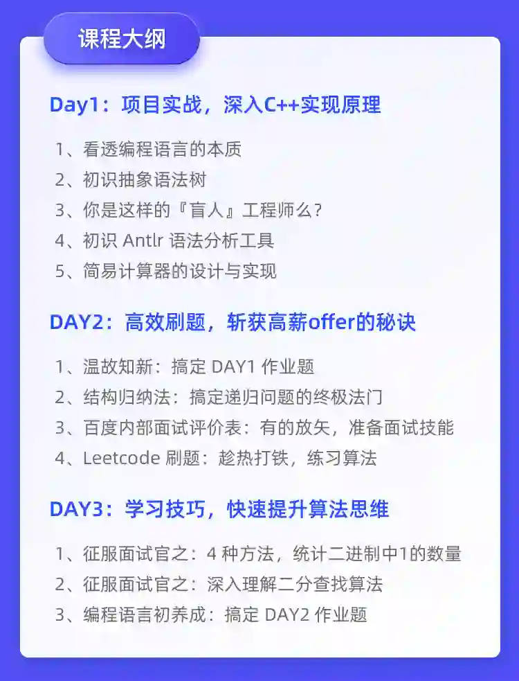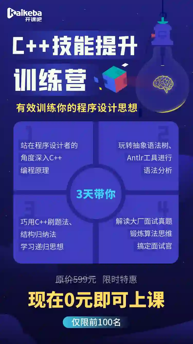 直播课程中,老师会运用C++基本知识和编程思想,带你先迅速地实现一个基础版语言解释器,然后不断迭代深入,层层递进,最终完成一门自制的编程语言,就像当年Python之父完成Python语言解释器一样。
