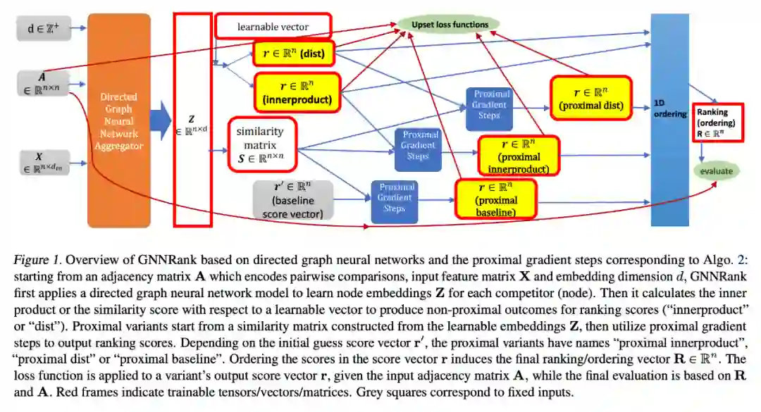从编码成对比较、输入特征矩阵 X 和嵌入维数 d 的邻接矩阵 A 出发,GNNRank 首先应用有向图神经网络模型来学习每个竞争者 (节点) 的节点嵌入 Z。然后,它计算内积或关于可学习向量的相似性分数,以产生非近端结果的排名分数 (“innerproduct” 或 “dist”)。
