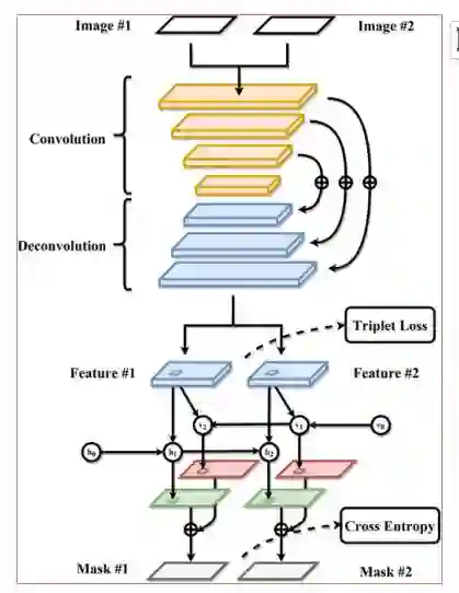 上半部分是CNN,它提取特征以密集的方式。它包括用于多尺度特征表示的全卷积部分和用于细节细化的反卷积部分。下半部分是一个浅双向递归结构,用于预测两幅图像中关键点的位置。请注意,实际网络的隐藏层比绘制的要多。训练的目标函数分别是(5)和(9)中定义的三重损失和交叉熵。