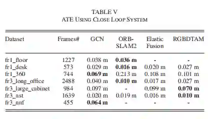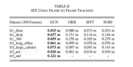 与其他方法相比,GCN在所有序列上都达到了最佳性能。尤其是在场景fr3-nnf中,一种纹理很弱的墙,在这种墙中,GCN仍然能够产生可跟踪的特征,而其他的则无法跟踪。