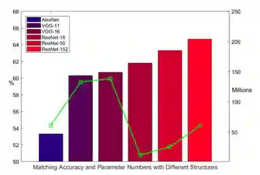 图3 对比使用Kitti Raw[44]道路场景的不同结构,我们使用序列[1、2、5、9]进行培训,并在本测试中使用[11、13]进行测试。条形图表示总体匹配精度,显示在左垂直轴上,绿点表示参数个数,显示在右垂直轴上。