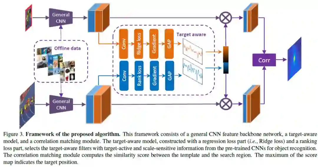摘要:现有的深度跟踪器主要使用卷积神经网络对泛型目标识别任务进行预处理来表示。尽管在许多视觉任务中都取得了成功,但是使用预先训练的深度特征进行视觉跟踪的贡献不如目标识别那么重要。关键问题是,在视觉跟踪中的目标的可以是任意对象类与任意形式。因此,预先训练的深层特征在建模这些任意形式的目标时效果较差,无法将它们从背景中区分出来。在本文中,我们提出了一种新的学习目标感知特征的方法,该方法能够比预训练的深度特征更好地识别发生显著外观变化的目标。为此,我们提出了回归损失和排名损失来指导目标活动和尺度敏感特征的生成。我们根据反向传播的梯度来识别每个卷积滤波器的重要性,并基于用于表示目标的激活来选择目标感知特征。目标感知特征与Siamese匹配网络集成,用于视觉跟踪。大量的实验结果表明,该算法在精度和速度上均优于现有的算法。