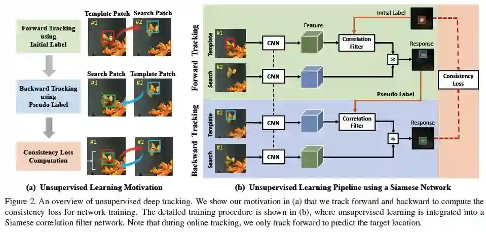 摘要:我们在本文中提出了一种无监督视觉跟踪方法。与现有的使用大量标注数据进行监督学习的方法不同,我们的CNN模型是以一种无监督的方式对大规模无标记视频进行训练的。我们的动机是,一个健壮的跟踪器应该在前向和后向预测中都是有效的(即,跟踪器可以在连续帧中对目标对象进行前向定位,并在第一帧中回溯到目标对象的初始位置)。我们在Siamese相关滤波器网络上构建了我们的框架,该网络使用未标记的原始视频进行训练。同时,我们提出了一种多帧验证方法和代价敏感的损失函数,以方便无监督学习。在没有监督信息的情况下(without bells and whistles),所提出的无监督跟踪器达到了完全监督跟踪器的baseline精度,这需要在训练过程中完整且准确的标签。此外,无监督框架显示了利用无标记或弱标记数据进一步提高跟踪精度的潜力。
