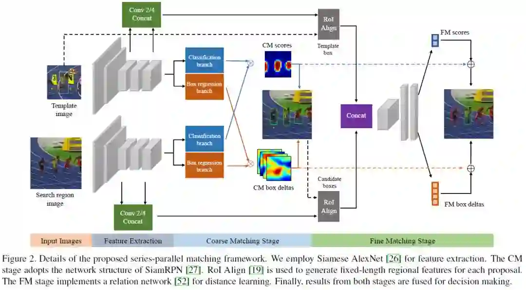 摘要:视觉目标跟踪面临的最大挑战是同时要求鲁棒性和识别能力。为了解决这一问题,本文提出了一种基于SiamFC的跟踪器,SPM-Tracker。基本思想是在两个独立的匹配阶段处理这两个需求。粗匹配(CM)阶段通过广义训练增强了鲁棒性,而精细匹配(FM)阶段通过远程学习网络增强了分辨能力。当CM阶段的输入提议由CM阶段生成时,这两个阶段串联连接。当匹配分数和box位置细化被融合在一起产生最终结果时,它们也被并行连接。这种创新的串并联结构充分利用了两个阶段,从而实现了卓越的性能。该SPM-Tracker在GPU上运行速度为120fps,在OTB-100上的AUC为0.687,在VOT-16上的EAO为0.434,显著超过其他实时跟踪器。