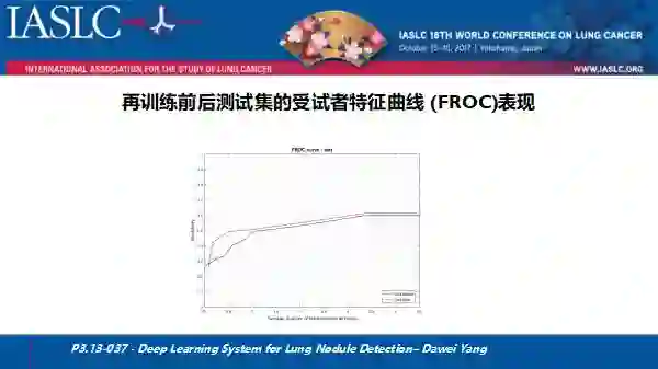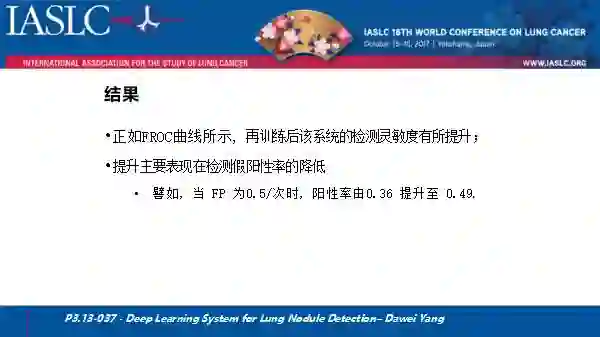 在肺结节的早期诊断上,不论是否有高危因素,常规低剂量体检中我国人群都会偶尔发现一些结节,在此背景下,本中心白春学教授在肺癌防治联盟的多中心早期诊断项目中,结合肺结节相关的CT影像技术进行深度挖掘,并联合国内外CT影像智能分析的多个团队开发出一套系统。去年利用该系统回顾性分析了三公分左右的早期肺结节的术前、术后病理影像的相关性,结果发现这一基于人工智能深度挖掘的系统,可协助我们将术前的判断率、敏感率提高到95%左右,上述结果在去年WCLC上完成了口头报告。而在2017年度,我们主要针对一些亚厘米级的结节,尤其是4㎜-1cm之间的结节,进一步扩大了研究范围。本次WCLC我们公布了4mm以下结节的分析结果,因很多国外指南将4mm以下结节纳入良性,为什么我们要分析这一数据集呢?因为人工智能对于大部分临床医生而言比较陌生,尚未在临床应用,我们首先测试这一技术是否能够在临床中及早发现微小结节,纳入本中心300例患者,应用DCNNs深度卷积神经网络计算机人工智能学习方法,结果发现,通过计算机第一次学习并结合临床医生标记后的再学习之后,该人工智能系统的第一阳性检测率明显提升。在接下来的工作中,我们会进一步扩大研究范围,尝试分析4-8mm以及8-12mm范围的结节的早诊率和良恶性的判别率。