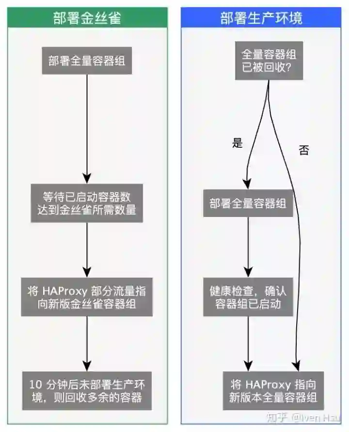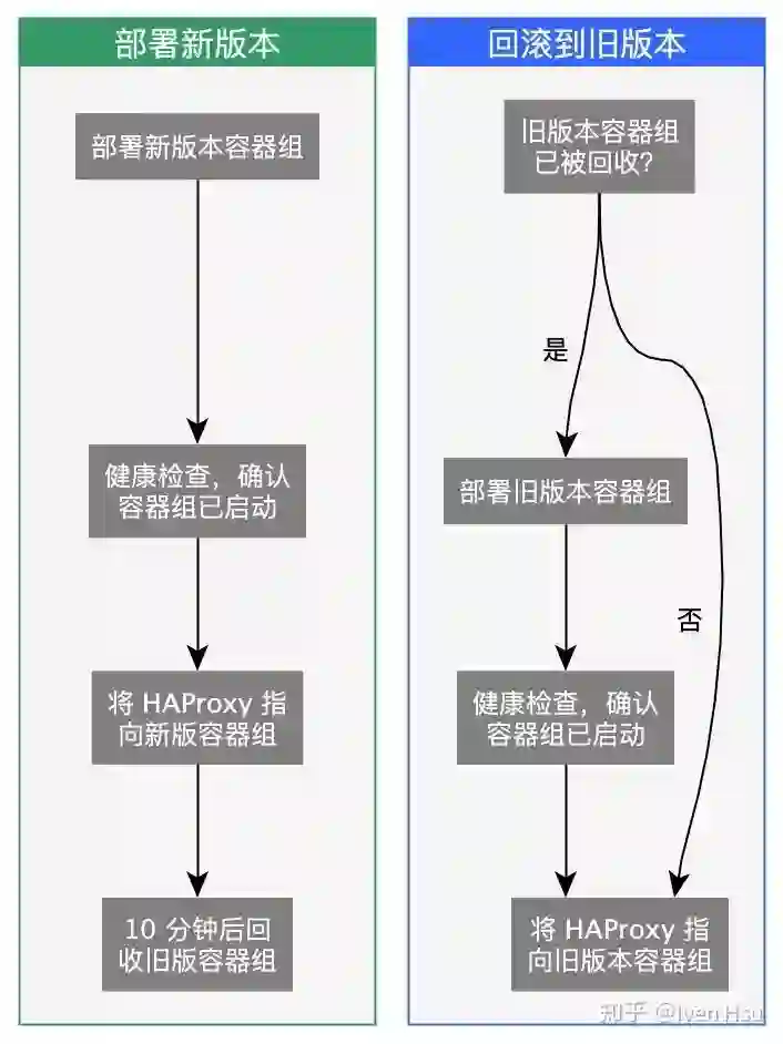 我们设计了一套新的部署逻辑,实现了蓝绿部署,即新旧版本容器组同时存在,使用 HAProxy 做流量切换:
