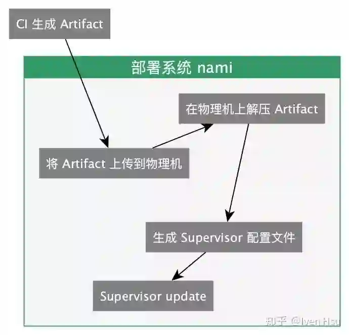最初的部署系统采用 Fabric 作为基础,将 CI 产生的 Artifact 上传到物理机上解压,并使用 Supervisor 进行进程管理,将服务启动起来: