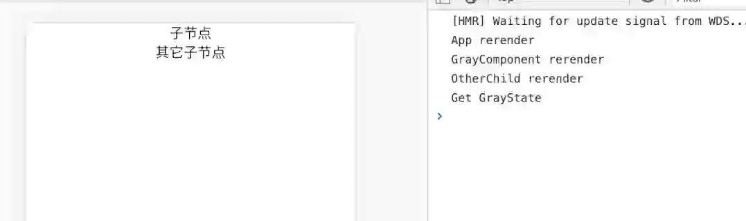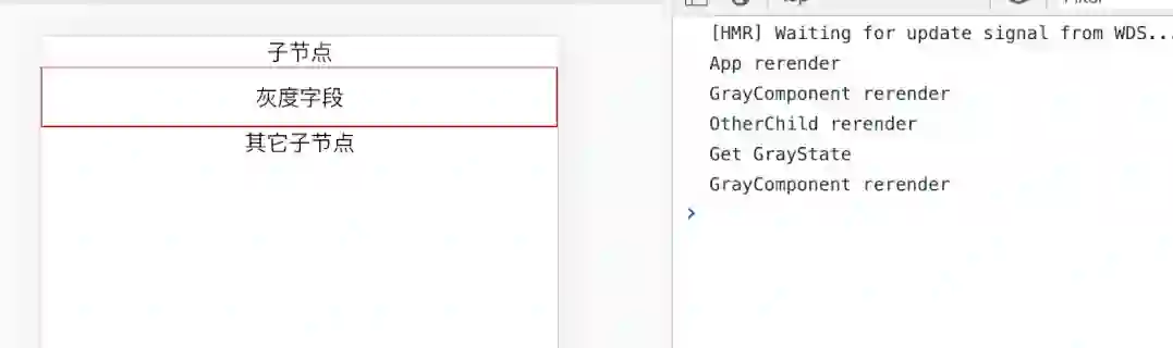// GrayState.jsclass GrayState {constructor() {this.observers = [];this.status = {};}attach(func) {if (!this.observers.includes(func)) {this.observers.push(func);}}detach(func) {this.observers = this.observers.filter(observer => observer !== func);}updateStatus(val) {this.status = val;this.trigger();}trigger() {for (let i = 0; i < this.observers.length; i++) {this.observers[i](this.status);}}}export default new GrayState();// App.jsimport GrayState from './GrayState.js';function App() {console.log('App rerender');useEffect(() => {console.log('Get GrayState');setTimeout(() => {const nextStatus = {gray: true,};GrayState.updateStatus(nextStatus);}, 200);}, []);return (<div><GrayComponent /><OtherChild /></div>);}// GrayComponent/index.jsimport GrayState from './GrayState.js'function GrayComponent() {console.log('GrayComponent rerender');const [visible, setVisible] = useState(false);useEffect(() => {const changeVisible = (status) => {setVisible(status.gray);};GrayState.attach(changeVisible);return () => {GrayState.detach(changeVisible);};}, []);return (<div>子节点{visible && <div>灰度字段</div>}</div>);}