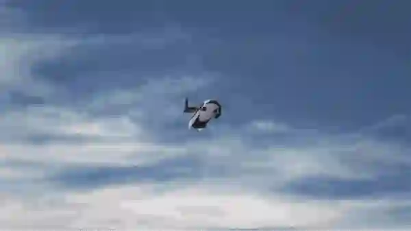 起飞阶段,它依靠两个螺旋桨来提供升力和部分前进的动力。当获得足够的高度时,这两个螺旋桨会收起来,只依靠车尾的涵道式风扇推进。