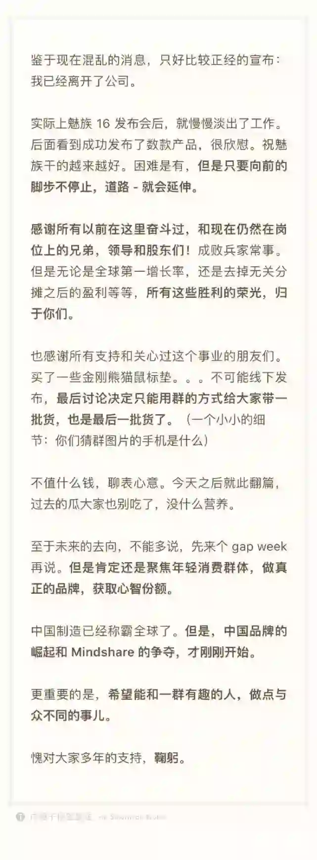 魅族李楠正式宣布离职:已经离开公司 未来会聚焦年轻消费群体