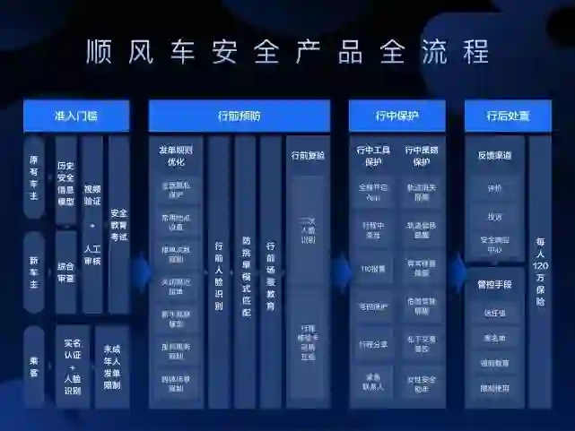 据介绍,在安全整改的300多天里,滴滴顺风车共迭代了12个版本,优化了226项功能,整合了包括准入门槛、行前预防、行中保护、行后处置四大模块在内的上百个安全功能和策略。
