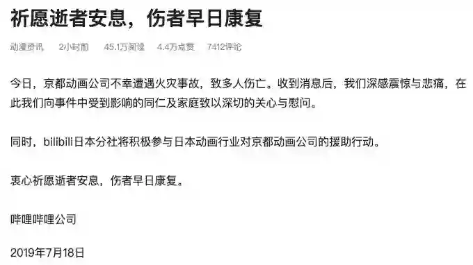 B站发布公告称,对京都动画公司不幸遭遇火灾事故深感震惊与悲痛,同时,bilibili日本分社将积极参与日本动画行业对京都动画公司的援助行动。