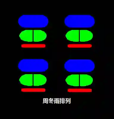 iPhone X/Xs/11 Pro系列采用的三星Super Amoled屏幕,放大就是上图这样的色块。通过修改“颜色大小”,让蓝色更大,从而获得更长的发光时间。上图也是“钻石排列”的示意图,是目前Amoled在显示效果和使用寿命之间取得平衡的“最优解”。缺点是像素点大小不同,显示效果也要打折扣,同样分辨率比起LCD总是要低一点。