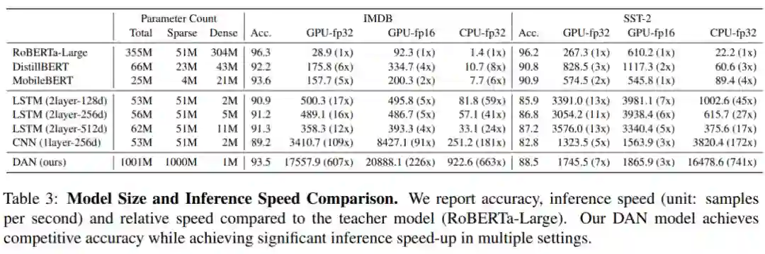 作者分别选取了三类模型,作为本文模型的对比实验:(1)不加入模型蒸馏,直接训练学生模型;(2)使用不基于 DAN 的学生模型结构,例如 Bi-LSTM 或 CNN;(3)直接对已有的压缩模型进行 fine-tune,例如 DistilBERT [2] 和 MobileBERT [3]。