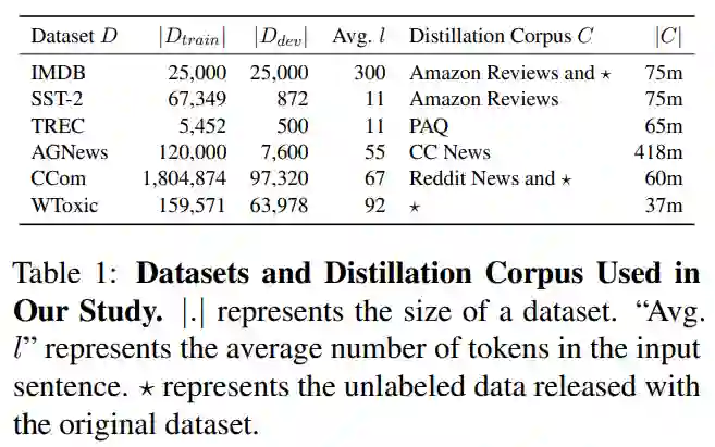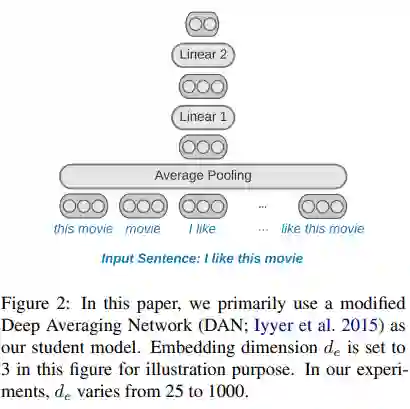 本文使用的学生模型基于 DAN(Deep Averaging Network) 网络 [1],其采用简单的架构,将输入句子中的 n-gram 映射到 embedding 并进行平均池化聚合,然后再使用多个线性层进行分类。通过选择 n-gram 词汇表和 embedding 维度,DAN 可以扩展到数十亿个参数。同时,由于在训练和推理期间 DAN 被稀疏激活,因此成本可以保持在较低水平。DAN 的一个弱势在于无法像自注意力一样计算 long-range contexts,但是根据研究表明,在某些任务上 DAN 可以取得与自注意力相当的结果。