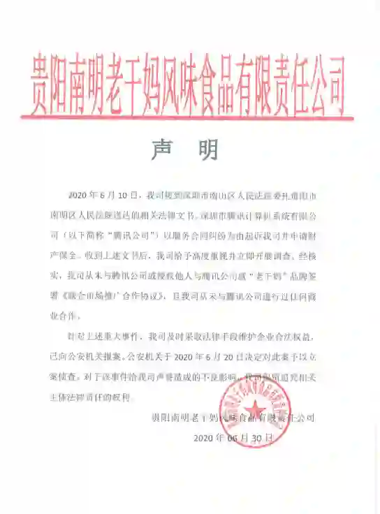 老干妈声明称,经核实,公司从未与腾讯或授权他人与腾讯就“老干妈”品牌签署《联合市场推广合作协议》,且从未与腾讯进行过任何商业合作。