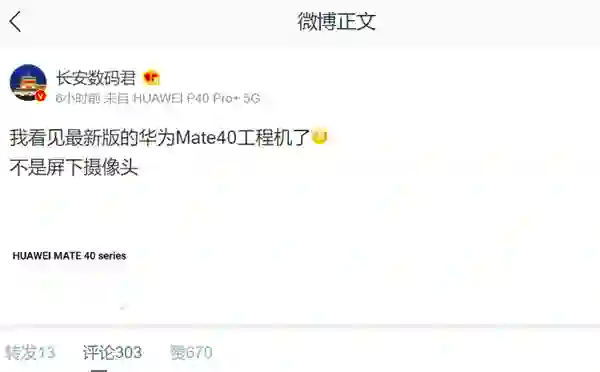 华为Mate 40工程机曝光:未采用屏下摄像头