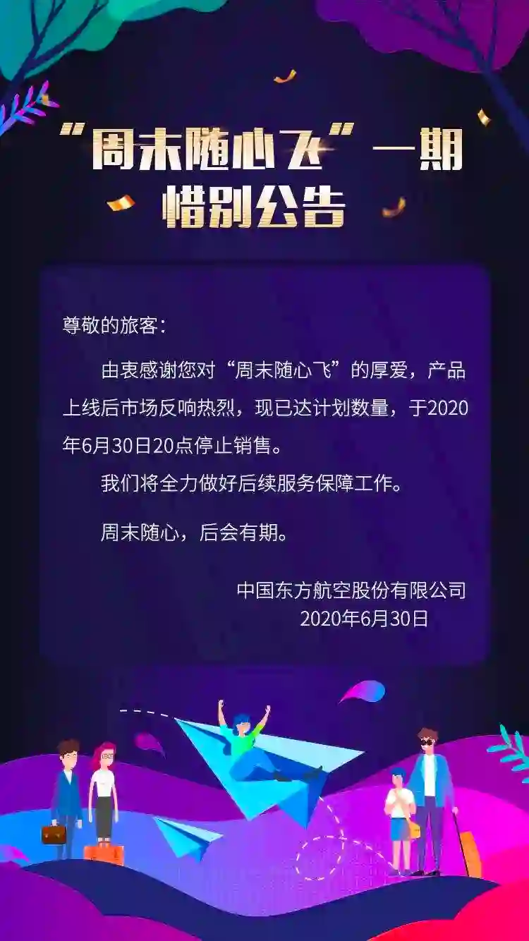 东方航空6月30日晚间发布消息称,“周末随心飞”产品上线后市场反应热烈,现已达到计划数量,于2020年6月30日20点停止销售,将做好后续服务保障工作。
