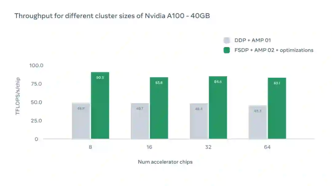 该研究还讨论了不同 GPU 配置的影响。在每种情况下,系统都实现了比分布式数据并行(DDP)基线水平更高的吞吐量。随着芯片数量的增加,由于设备间通信的开销,我们可以观察到吞吐量略有下降。然而,即使用 64 块 GPU,Meta 的系统也比 DDP 基准快 1.83 倍。