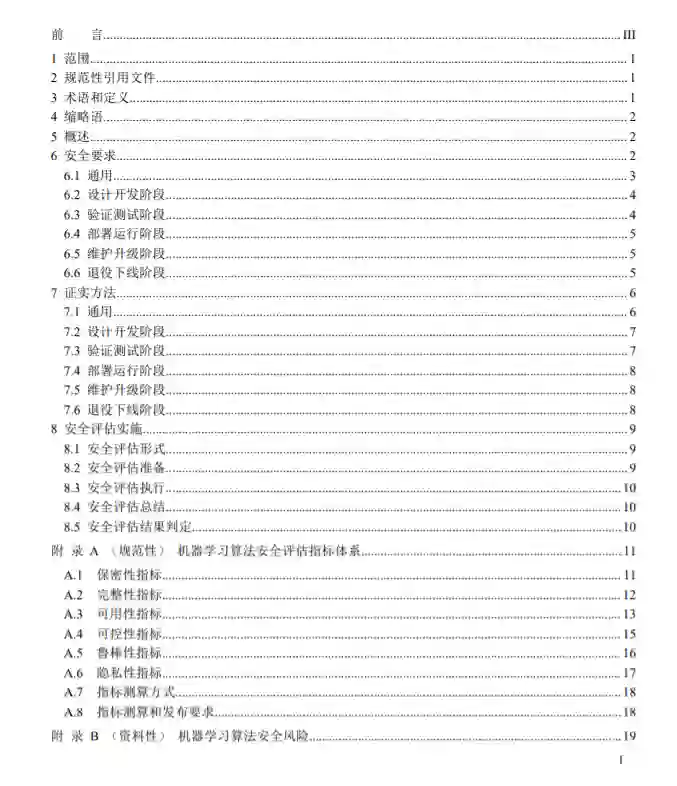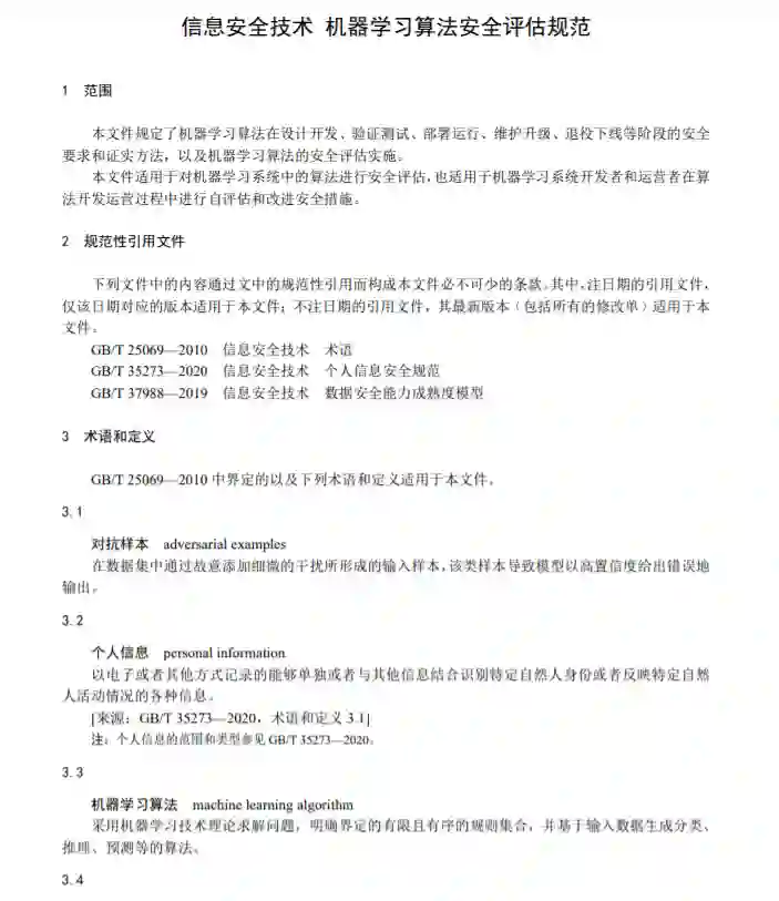 《信息安全技术 机器学习算法安全评估规范》国家标准,本文件本文件规定了机器学习算法在设计开发、验证测试、部署运行、维护升级、退役下线等阶段的安全 要求和证实方法,以及机器学习算法的安全评估实施。本文件适用于对机器学习系统中的算法进行安全评估,也适用于机器学习系统开发者和运营者在算 法开发运营过程中进行自评估和改进安全措施。