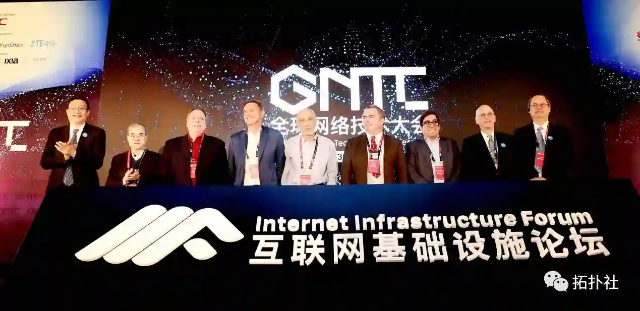 揭幕仪式现场,中国工程院院士、中国互联网协会理事长邬贺铨,互联网DNS协议发明人、互联网名人堂入选者Paul Mockapetris博士,互联网域名软件发明人、互联网名人堂入选者Paul Vixie博士,韩国互联网之父、互联网名人堂入选者Kilnam Chon教授,日本WIDE创始人、互联网名人堂入选者Jun Murai教授(现场代表),美国国家工程院院士、SDN之父Nick McKeown教授,Linux基金会运营副总裁Phil Robb先生,MEF论坛高级副总裁Dan Pitt博士,全球IPv6论坛主席Latif Ladid教授(现场代表)以及我国下一代互联网国家工程中心主任刘东等十位全球最顶级的互联网专家共同为“互联网基础设施论坛(IIF)”揭幕。