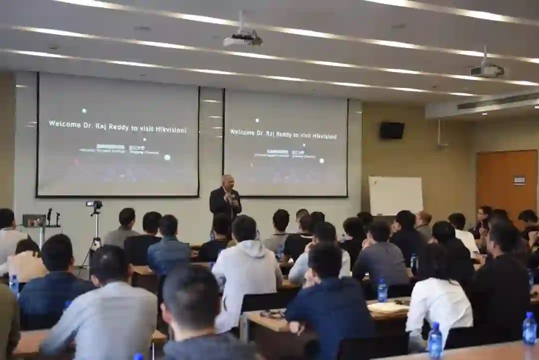展厅参观结束后,Reddy教授为海康威视员工带来了一场题为《AI Empowered Innovation》的精彩演讲。他阐述了当前人工智能技术在数据驱动下取得的范式革命和重大突破,分析了大众对人工智能的几大误解,并预言了AI将对人类未来知识创新和社会经济产生的重大影响。