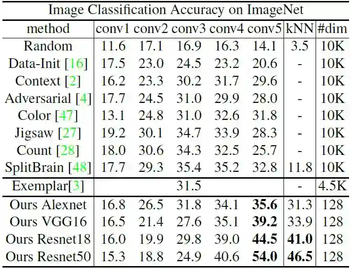 研究者在 ImageNet ILSVRC [34] 上学习特征表示,并将他们的方法与代表性的无监督学习方法进行比较。