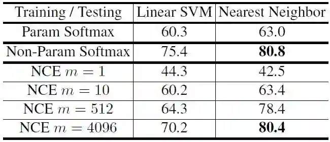 表 1:通过在学习到的特征上应用线性 SVM 或 kNN 分类器在 CIFAR10 的 Top-1 准确率。本文提出的非参数化的 softmax 优于参数化的 softmax,并且用 NCE 方法 得到的准确率随 m 单调递增。