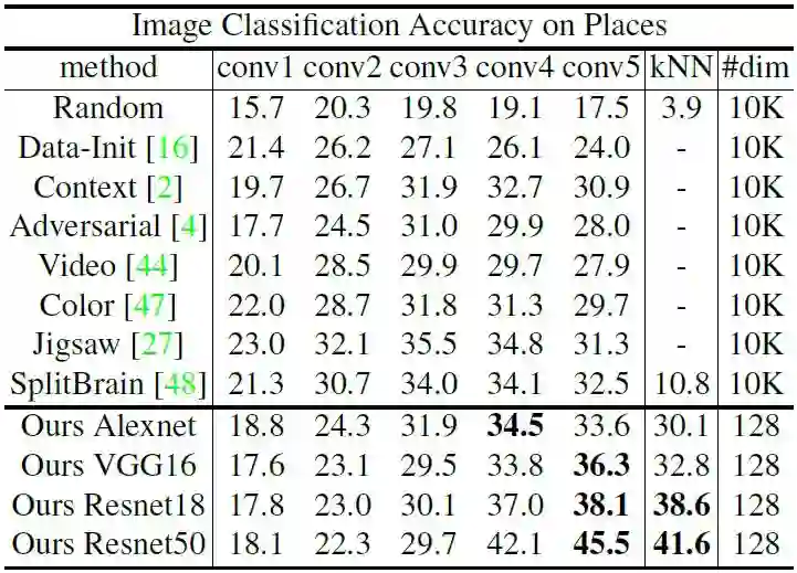 实验结果表明,在无监督领域,该方法在图像分类方面远超过最先进的方法。具体地,在 ImageNet 1K [1] 上的 top-1 准确率为 46.5%,Places 205 [41] 为 41.6%。若有更多的训练数据和更好的网络架构,该算法会持续提高测试结果。
