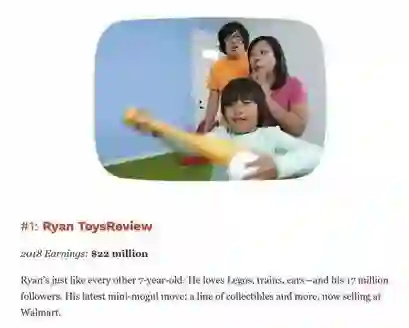 而Ryan,也成为了2018年,福布斯杂志发布的YouTube最赚钱博主第一名,年入2200万美金。
