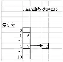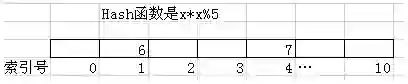 我们假设一个Hash函数是x*x%5。当然实际情况里不可能用这么简单的Hash函数,我们这里纯粹为了说明方便,而Hash表是一个长度是11的线性表。如果我们要把6放入其中,那么我们首先会对6用Hash函数计算一下,结果是1,所以我们就把6放入到索引号是1这个位置。同样如果我们要放数字7,经过Hash函数计算,7的结果是4,那么它将被放入索引是4的这个位置。这个效果如下图所示。