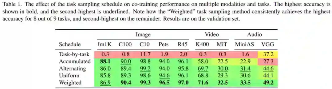 下表 1 展示了不同任务采样计划在不同模态和任务上对协同训练性能的影响,粗体表示最高准确率,下划线表示次最高准确率。其中,「Task-by-task」采样计划表现糟糕,仅在一项任务上实现了不错的性能,这是灾难性遗忘(catastrophic forgetting)造成的。