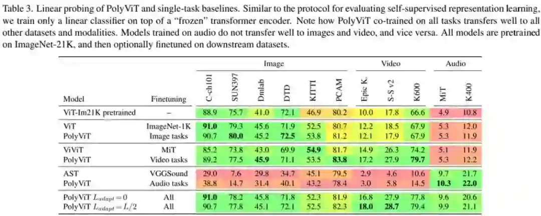通过为一个新任务仅仅添加和训练一个新的线性头(linear head),研究者对 PolyViT 学习到的特征表示进行评估。下表 3 展示了多种模态上训练的 PolyViT 如何学习「在跨图像、音频和视频三种模态的 11 个线性评估任务上均表现良好的」跨模态特征表示。同时,表 3 还展示了多种模态上的协同训练如何有益于学习强大、可迁移且可用于多个下游任务的特征表示。