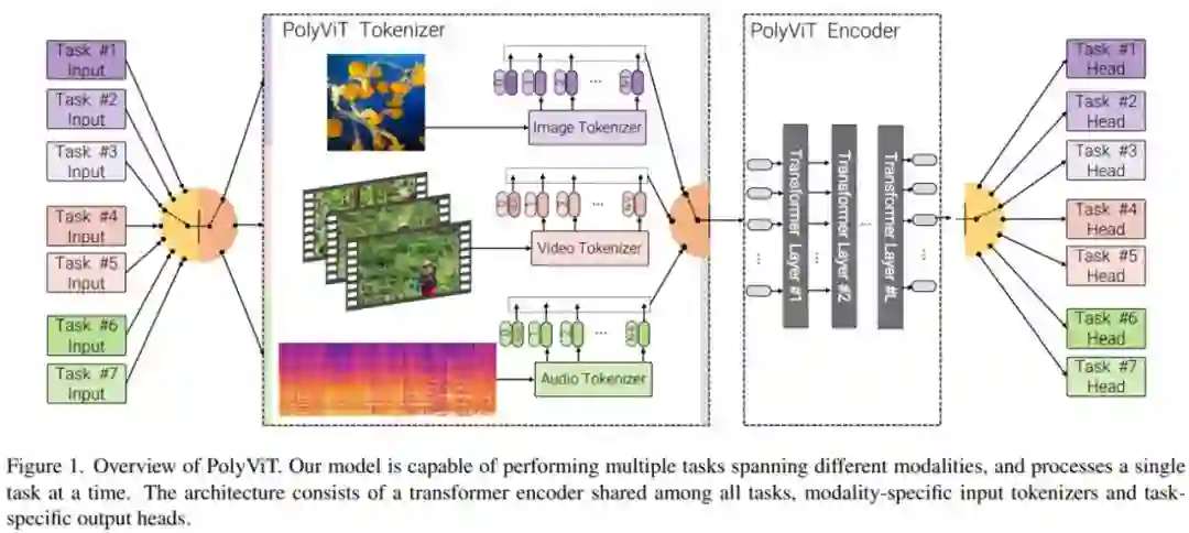 ,即同时在多个分类任务(可能跨多个模态)上训练单个模型。他们考虑了不同的设置,同时解决多达 9 个不同的图像、视频和音频分类任务。如上图 1 所示,PolyViT 模型能够执行多个任务,但对于给定的输入一次只能执行一个任务。虽然计算机视觉和自然语言领域探索过类似的方法,但研究者不清楚以往的工作是否考虑了多种模态以及是否使用这种方法实现了 SOTA 结果。
