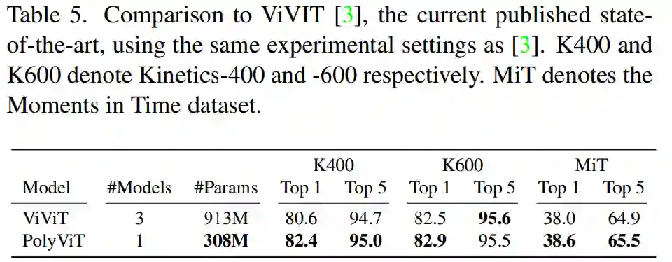 对于视频分类,研究者在 Kinetics-400、Kinetics-600 和 Moments in Time 数据集上协同训练了具有较小 tubelet size 的 PolyViT-Large 模型,并与当前 SOTA 模型 ViViT(使用相同的初始化、主干和 token 数量)进行了比较。结果如下表 5 所示,表明 PolyViT 在三个数据集上均超越了 ViViT。